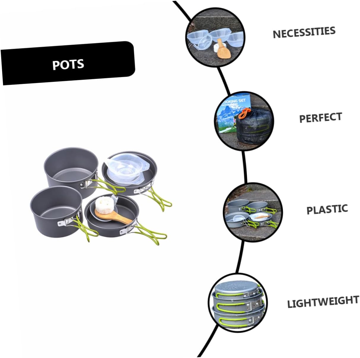 Package Include 1 x Big Pot 1 x Small Pot 1 x Big Frying Pan 1 x Small Frying Pan 3 x Plastic Bowls 1 x Plastic Soup Spoon 1 x Rice Scoop 1 x Cleaner Characteristics - Small Pot Size: . 14.5 x 7.9 cm / 5.7 x 3.11 inch Outdoor Cooker Kit. - Big Frying Pan Size: . 17.5 x 4.6 cm / 6.88 x 1.81 inch Cooking Pot. - Material: Alumina (pots, frying pans); plastic (bowl, soup spoon) Cooking Equipment. - Big Pot Size: . 16.9 x 9 cm / 6.65 x 3.54 inch Camping Cooking Supplies. - Frying Pan Size: . 16.7 x 3.9 cm / 6.57 x 1.53 inch Kit. - Color: Assorted Color Portable Kit. - Small Frying Pan Size: . 15.2 x 3.8 cm / 5.98 x 1.49 inch Camping Accessories. - This outdoor cookware set is designed for 2-3 people Alumina Pot Pan Set. - The non-stick and foldable design greatly provides you with convenience. Outdoor Kit - The suit is light and strong, which is suitable for any outdoor cooking activities, such as picnic, BBQ, camping, etc Backpacking Cookware. - The durable pot is not only resistant to high temperature, but also can quickly conduct heat in a short time to fry and cook food Camping Cookware. - Non-sticky design greatly provides you with convenience, easy to clean and wash Outdoor Cookware.Goods InformationPortable Kit Portable to carry and bring much convenience to you.Cooking Pot With this complete cookware set, you will enjoy a pleasant and tasteful meal time with your friends and family.Backpacking Cookware Are you still looking for a kit? If so, our mess kit is carefully prepared for you