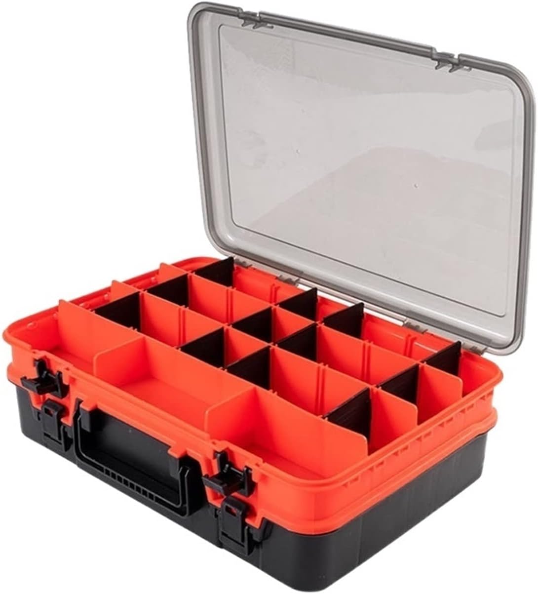 Enhance your outdoor experience with our versatile fishing tackle bag. Product name: Fishing gear box Style: double layer Function: double-layer bait storage, hook, portable. Color: black/orange Material: ABS Dimensions: 27 x 39 x 12 cm packing list: 1* fishing box 1*Instruction manual