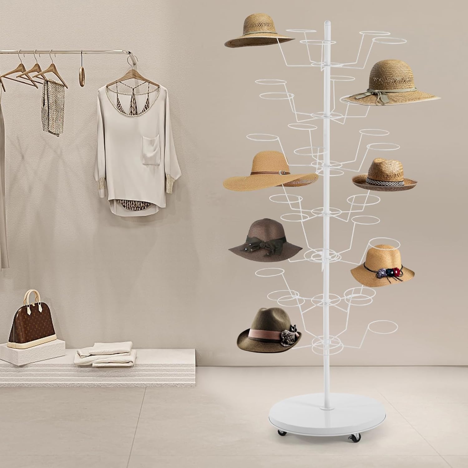 SpecificationsMaterial: Steel Pipe, Iron WireProcess: Baking PaintColor: WhiteStyle: ModernAssembly Required: YesRecommended Uses For Product: HatsMount Type: Free StandingNumber of Tiers: 7Number of Hat Positions: 35Number of Universal Wheels: 4(Two With Brakes)Total Load-bearing Capacity: 20kg/44.09lbsBase Diameter: 50cm/19.69inProduct Size(L*H): 60*170cm/23.62*66.93in Gross Weight: 6.5kg/14.33lbsNet Weight: 6kg/13.23lbsPackage Size: 60*60*20cm/23.62*23.62*7.87inPackage Included 1* Hat Rack1* English Installation DiagramAll Accessories for Assembly