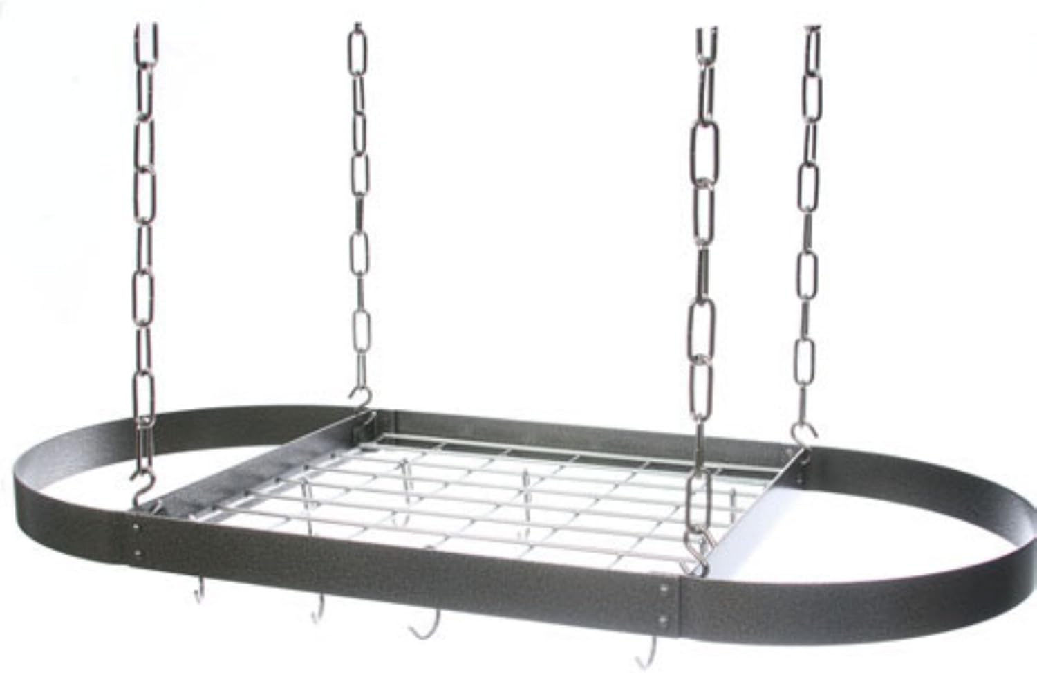 In hammered steel with chrome accessories, this large, oval pot rack is ideal for larger kitchens. It has a top grid that can be used for holding lids or other cookware items. The oval pot rack measures 40 x 20-in. and includes eight regular hooks, four grid hooks plus four pieces of 24-in. chain for suspending from your ceiling. Complete hanging instructions are included.