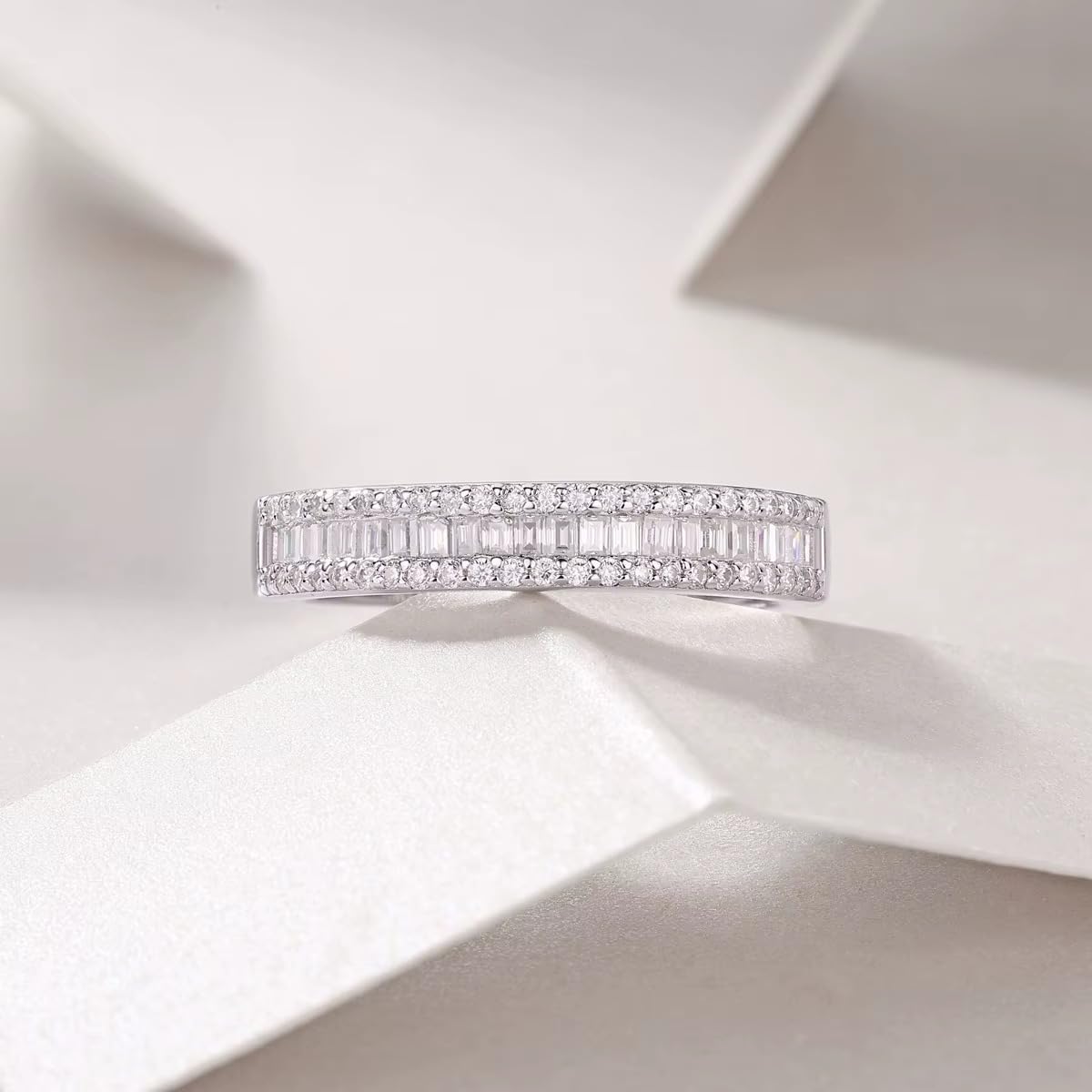 Elevate your jewelry collection with this stunning S925 Sterling Silver Women's Engagement Promise Ring, expertly crafted to capture the brilliance of luxury fine jewelry. At the heart of this exquisite design lies a sophisticated triple-row band featuring a center channel of 22 baguette-cut moissanite stones (0.008ct each), elegantly flanked on both sides by rows of 46 sparkling round moissanite stones (0.005ct each). The combination of these two distinct cuts creates a dazzling interplay of light and brilliance that is truly eye-catching. Crafted from genuine S925 sterling silver, this ring offers both durability and a radiant, polished finish that complements the luminous moissanite stones beautifully. Perfect as an engagement ring, promise ring, or a luxurious everyday accessory, this piece makes a thoughtful and memorable gift for the special woman in your life. The timeless design pairs effortlessly with any style, from casual to formal, making it a versatile addition to any jewelry wardrobe. Each ring arrives ready for gifting in an elegant jewelry box.