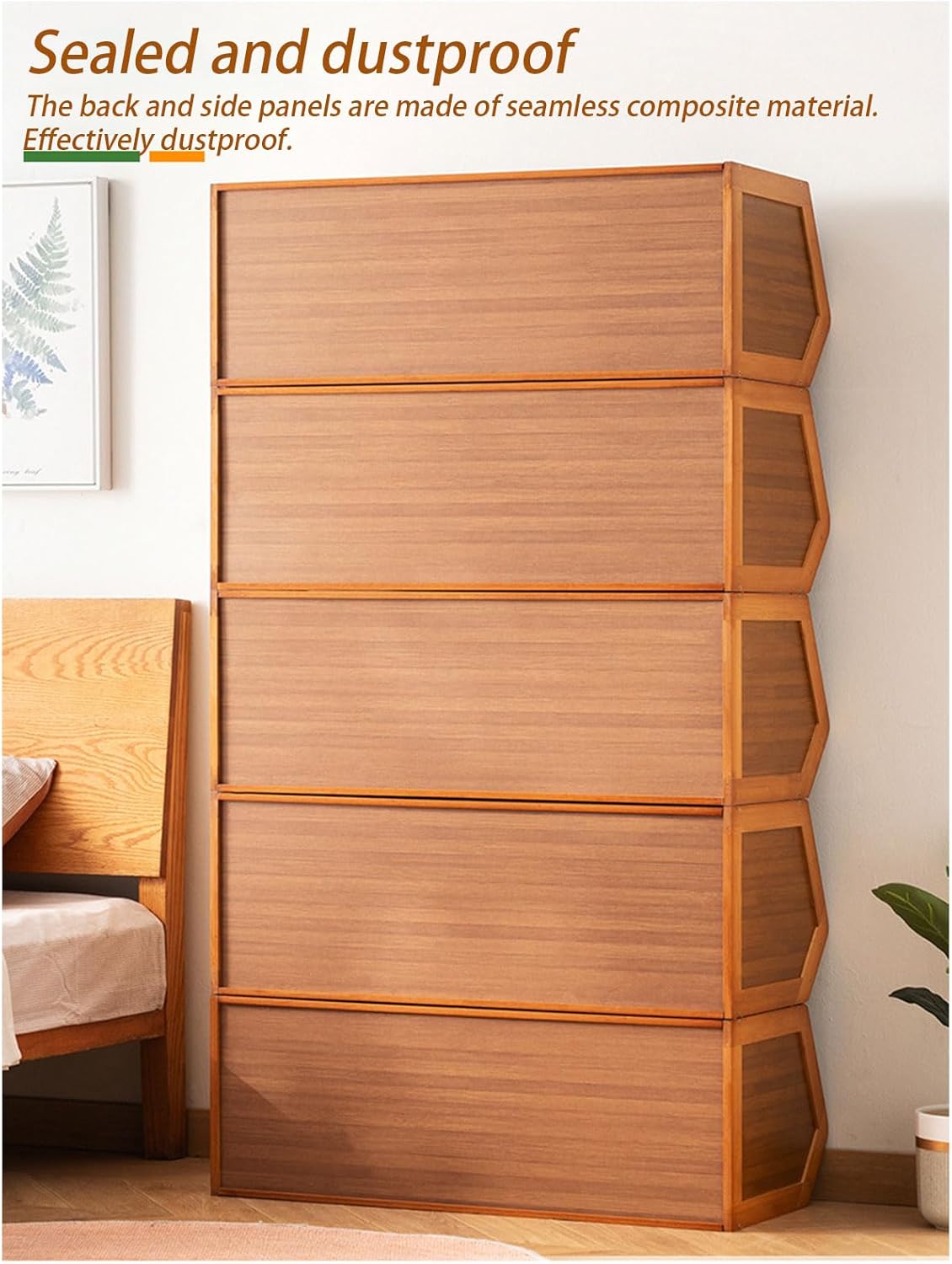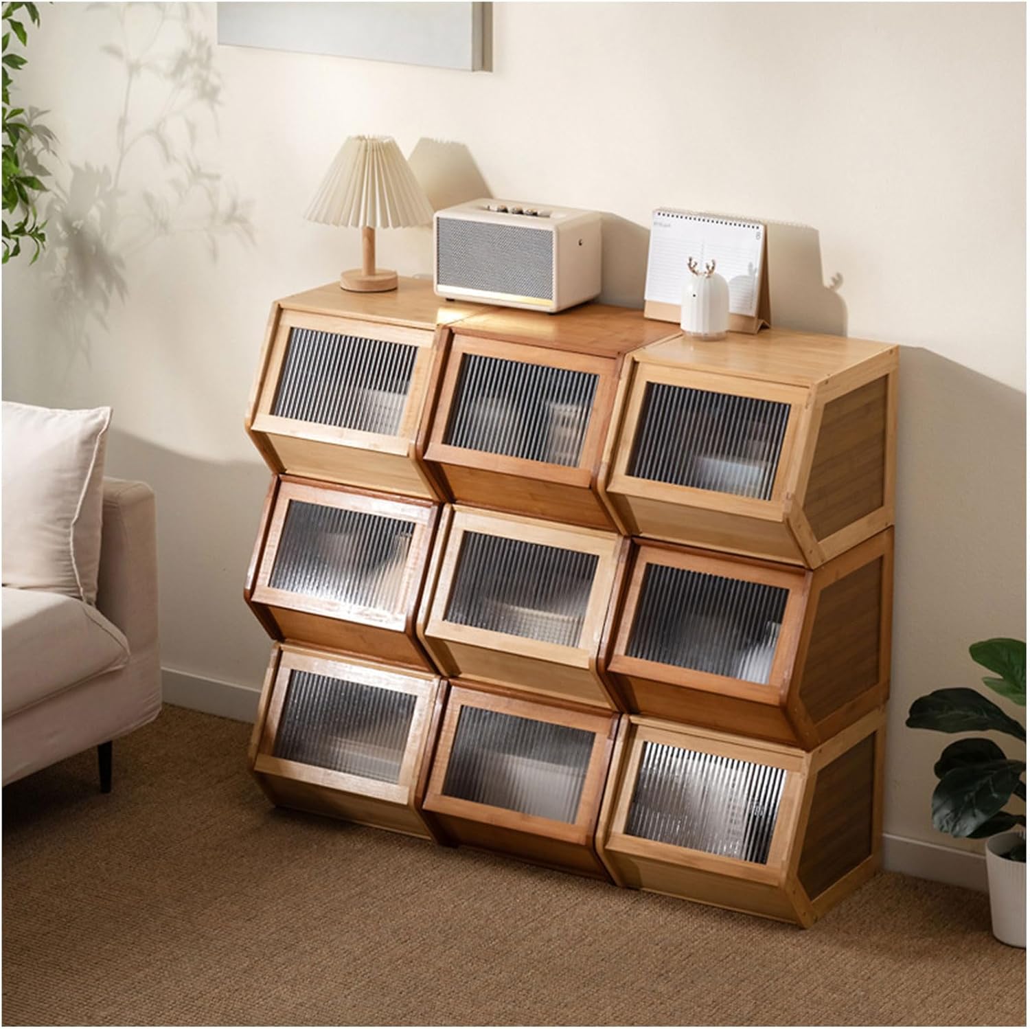 Product description This stackable bamboo storage bins is more than just a storage bins, it's a multifunctional product that can be used to meet your needs. Whether you use it as a bedroom TV stand, a small storage cabinet, or as a bedroom dresser to organise clothes, cosmetics or books, its flexible design allows you to place it anywhere in your home. The stackable feature offers even more customisation, making it the ideal stacking storage bins for any space.Features:The box features an inclined angle for a better view of the interior, making it easy to reach for your breadThe top of the bread box has a rim design, allowing you to place various items without worrying about them falling offThe thickened wavy acrylic panel is not only beautiful but also durableThe rounded edges are smooth and flat, avoiding accidental scrapes and making it safer to useSpecification:Material: Bamboo, Glass, Laminated BoardColor: Tea-colored,Log-colored,blakShape: TrapezoidAssembly Required: YesInstallation Type: Desktop Installation Manufacturer Contact Information [email protected] Please go to our store homepage to see it.