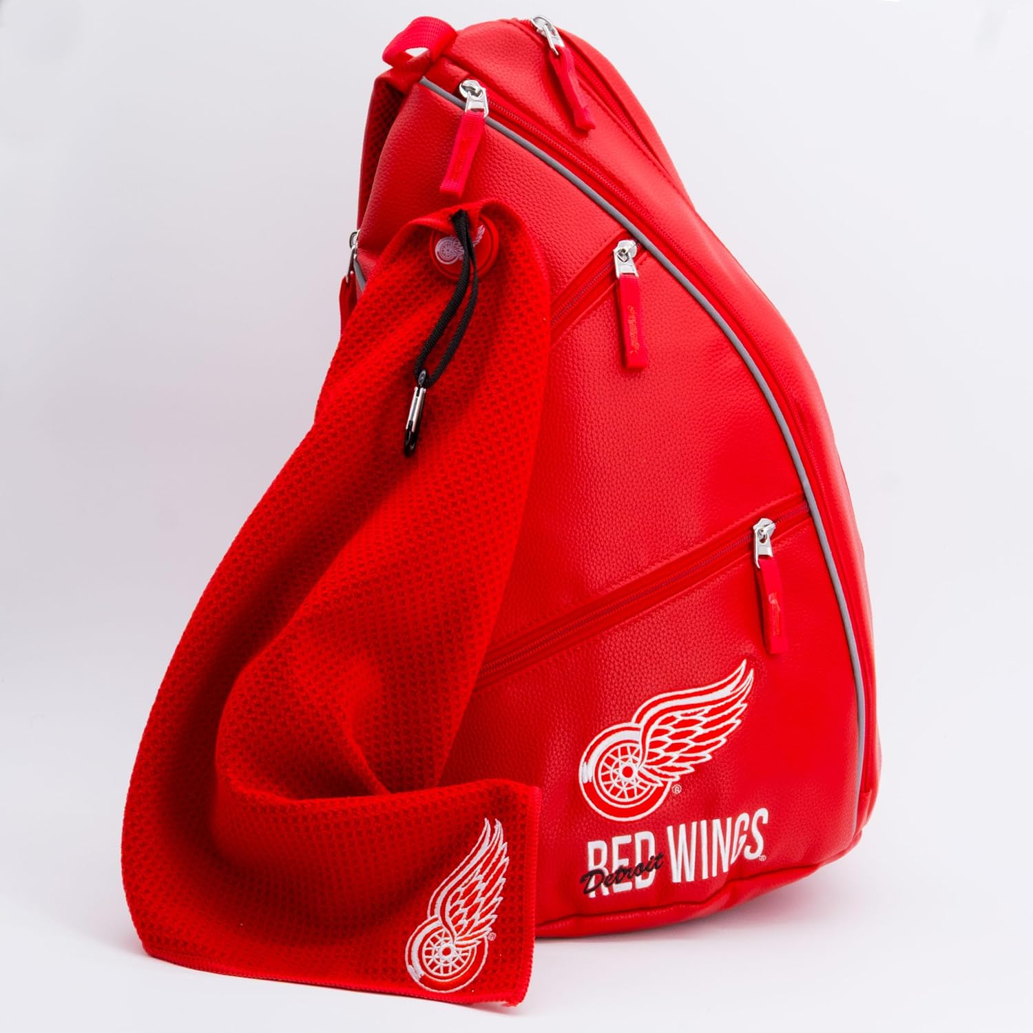 The PU Leather Embroidered Team Backpack features a magnetic towel catch, five zippered pockets and four internal mesh pockets, water bottle pocket and ergonomically designed straps for shoulder or cross-body carry.